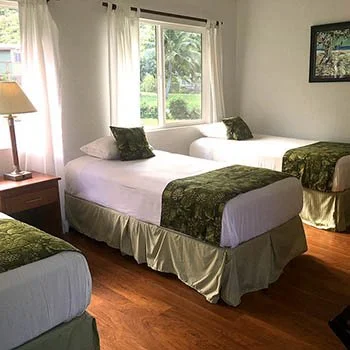 Dorm style room with triple sheeted beds. Fluffy spa towels, tropical scented soaps and shampoos will be provided.